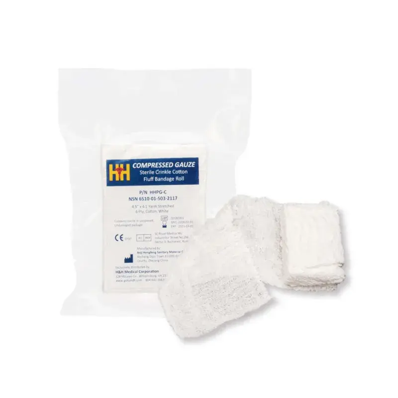 La gasa comprimida H&H es el complemento perfecto a los vendajes de compresión para detener la pérdida grave de sangre y salvar vidas.