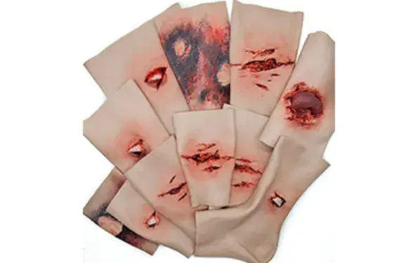 Este kit contiene 11 fundas de simulación diferentes, con una colección de diversas lesiones que van desde una fractura abierta, una herida importante, quemaduras de espesor completo y laceraciones. Ref. TR0320