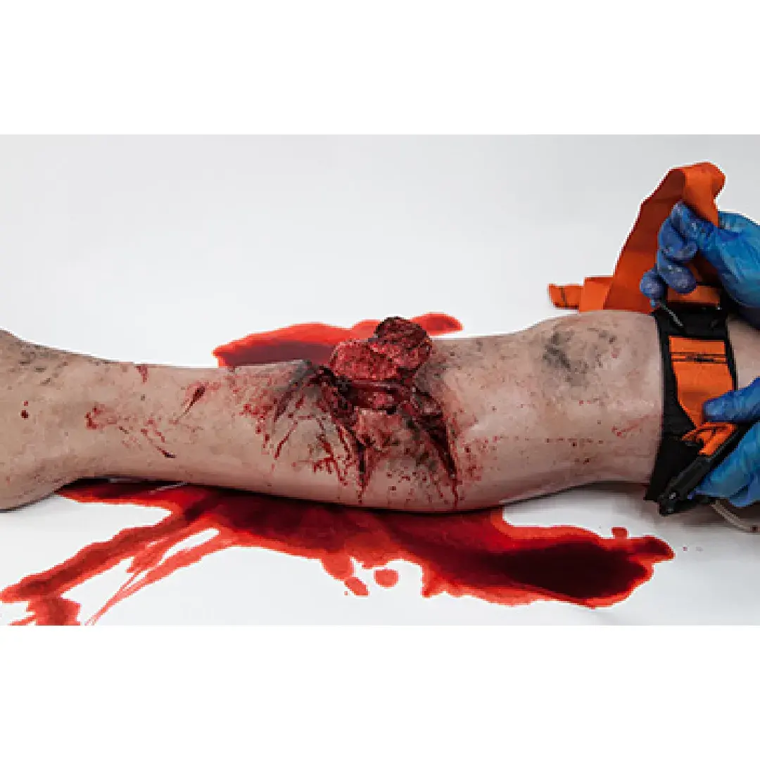 Este simulador tiene una lesión importante integrada en la parte inferior de la pierna, lo que expone el hueso y el músculo internos. Con tubos de sangrado integrados diseñados para proporcionar un sangrado hemorrágico realista usando una bomba manual, permite a los estudiantes practicar el control de la hemorragia usando torniquetes, vendajes y agentes hemostáticos.