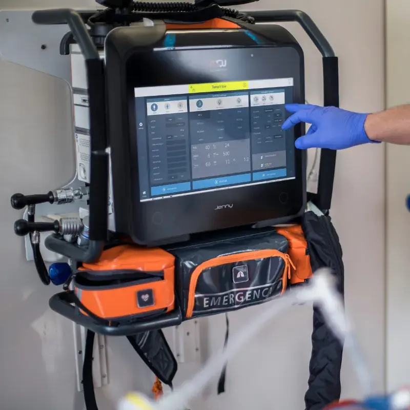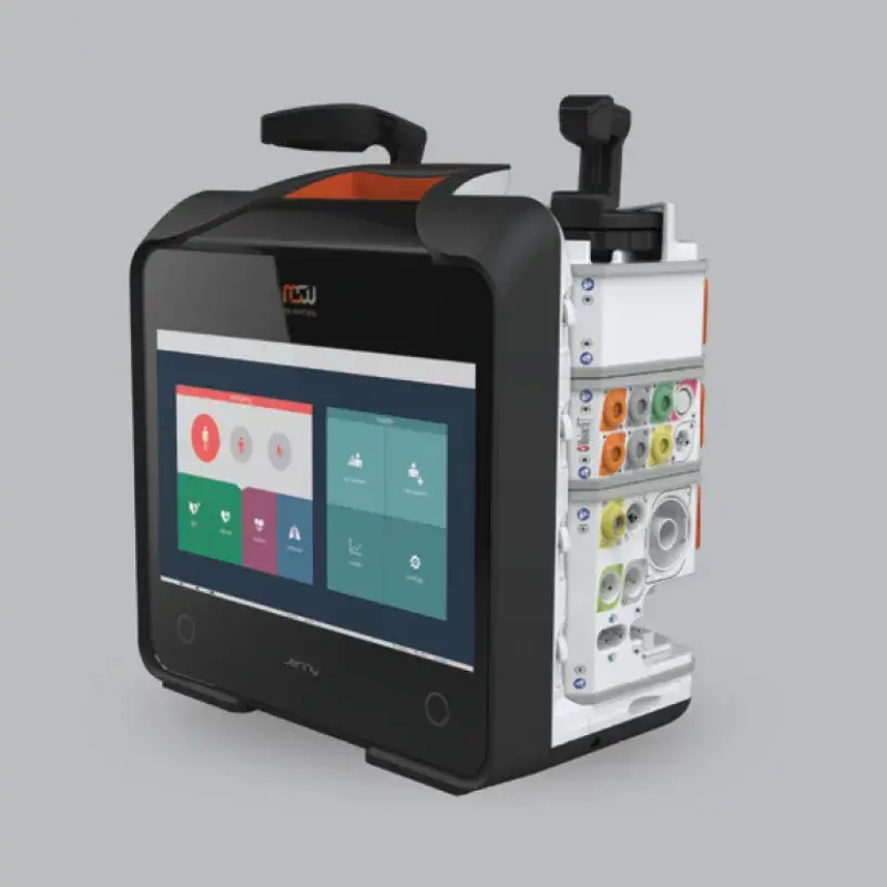 Jenny es un sistema modular de cuidados críticos en el punto de atención (modular point-of-care hybrid), diseñado para ofrecer ventilación, monitorización y desfibrilación en un solo equipo.