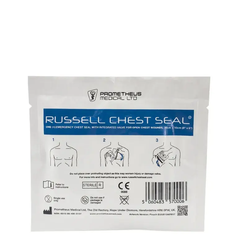 El Russell Chest Seal® es un parche torácico no oclusivo y ventilado con cuatro aberturas y una válvula integrada para heridas torácicas abiertas.